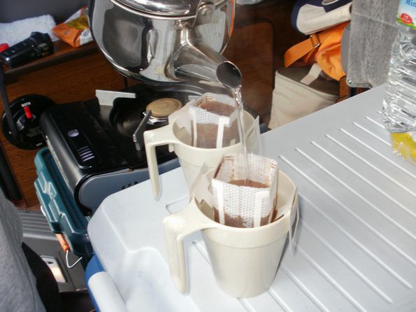 雨音を聞きつつ、車中でオヤツを食べながら、明日の行程を考え中。